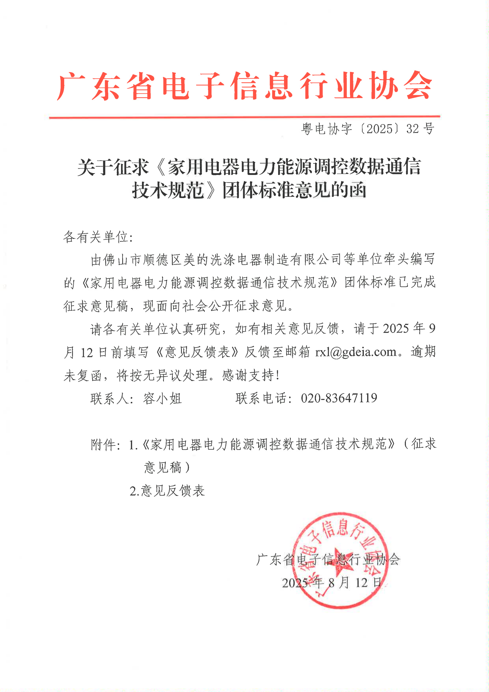 关于征求《家用电器电力能源调控数据通信技术规范》团体标准意见的函
