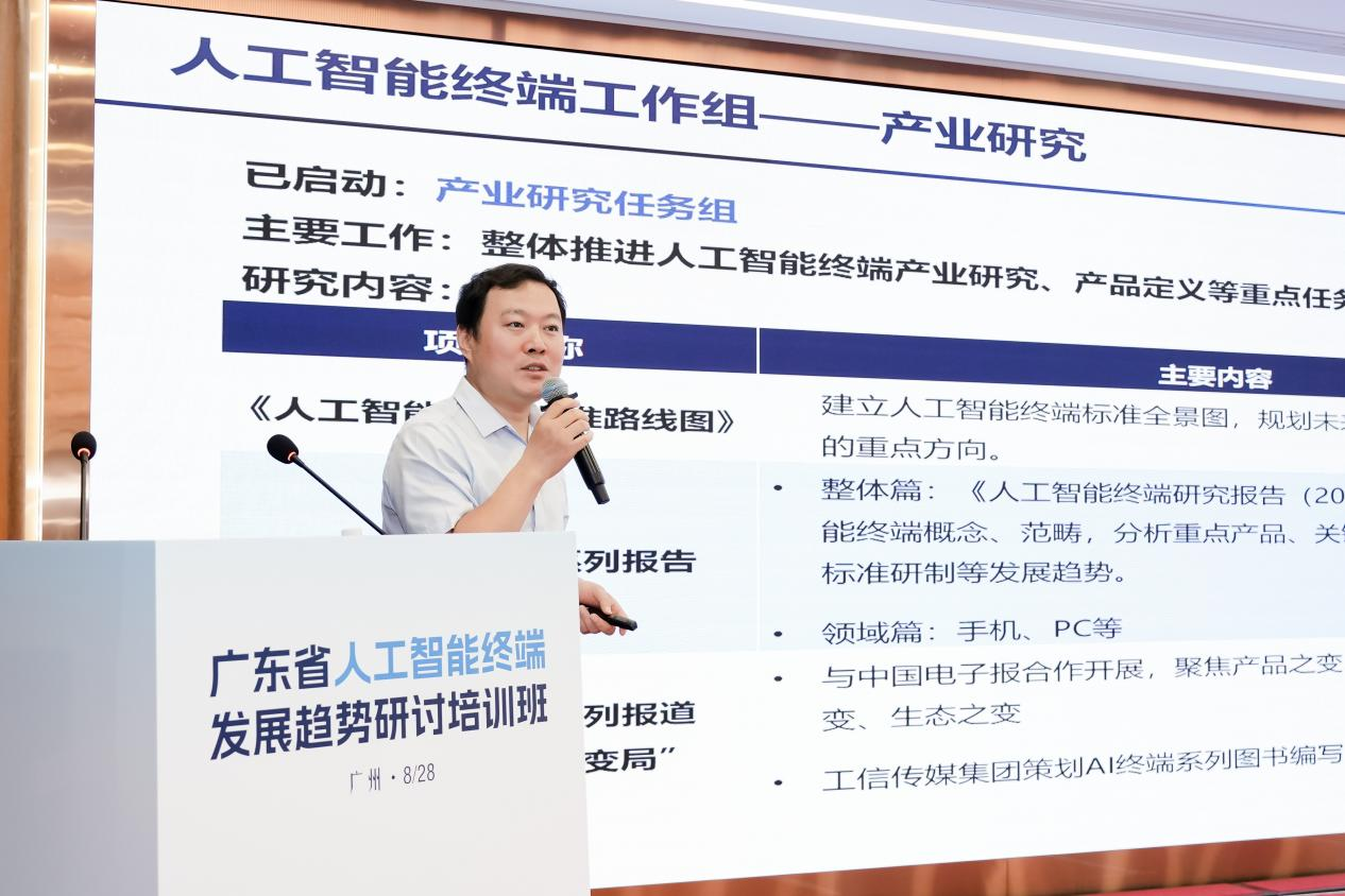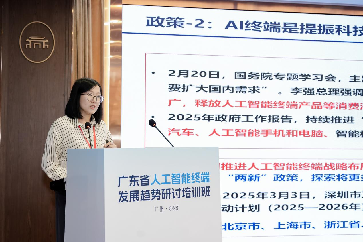 广东省工业和信息化厅二级巡视员万淑萍在培训动员讲话中表示,人工智能作为引领新一轮科技革命和产业变革的颠覆性技术,正在推动智能终端产业变革。广东发展人工智能终端产业具备得天独厚的优势,省委、省政府高度重视人工智能终端产业发展,出台系列政策和措施,推动人工智能终端产业规模稳居全国第一方阵,2024年广东人工智能核心产业规模超2200亿元,全省人工智能核心企业超1500家。下一步,广东将积极贯彻落实国家关于人工智能创新发展系列文件要求,打造全球人工智能终端产业发展创新高地。一是推动AI终端“强芯铸魂”,支持龙头企业开发AI终端通用芯片和专用芯片;二是推进终端芯片器件国产化,支持终端龙头企业应用国产芯片和器件;三是支持产业创新发展,支持广东龙头企业牵头或者参与AI终端技术产品标准制定AI智能体开发;四是加快国产AI终端应用推广,推动国产AI终端在制造、教育、医疗等领域广泛应用。