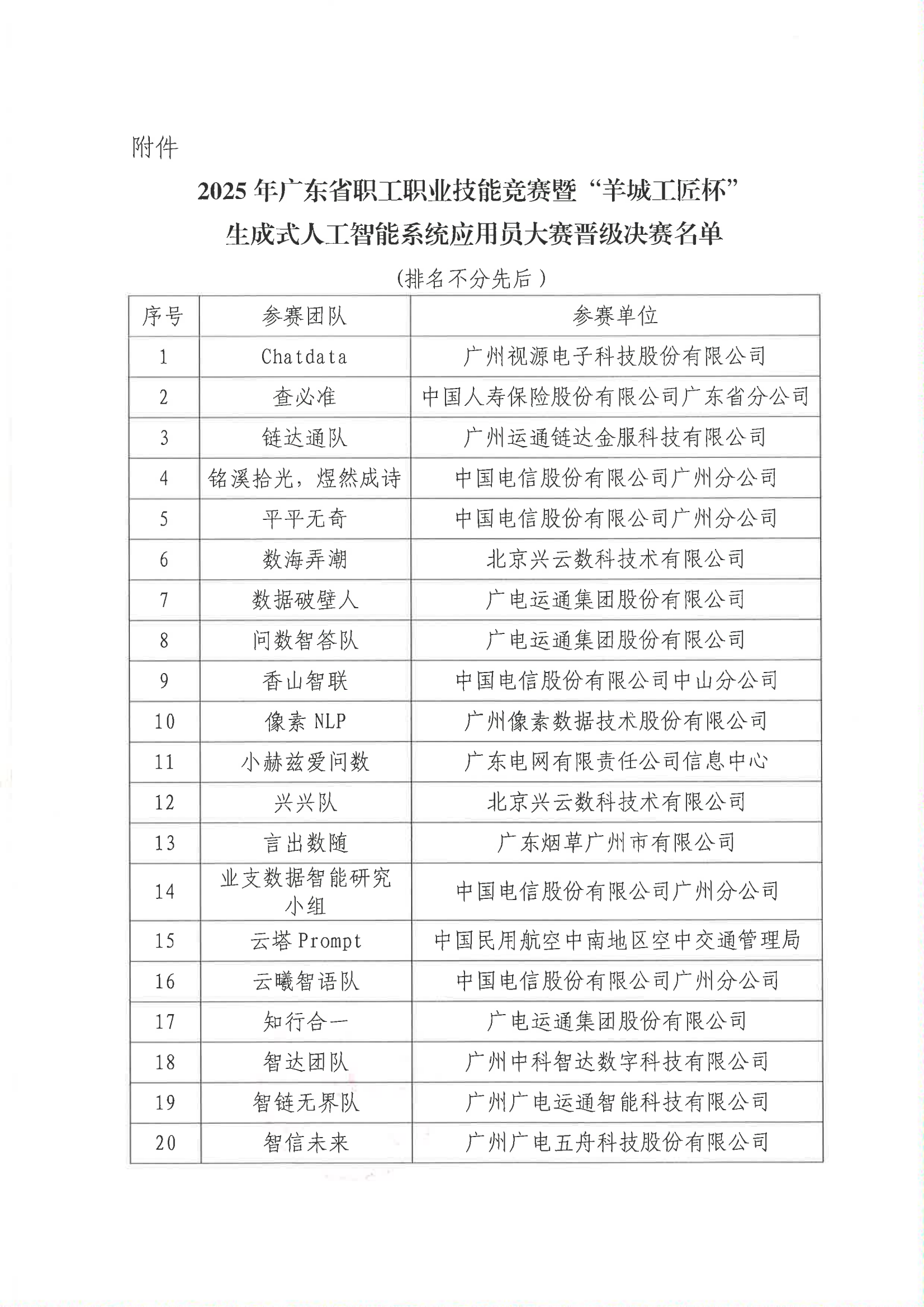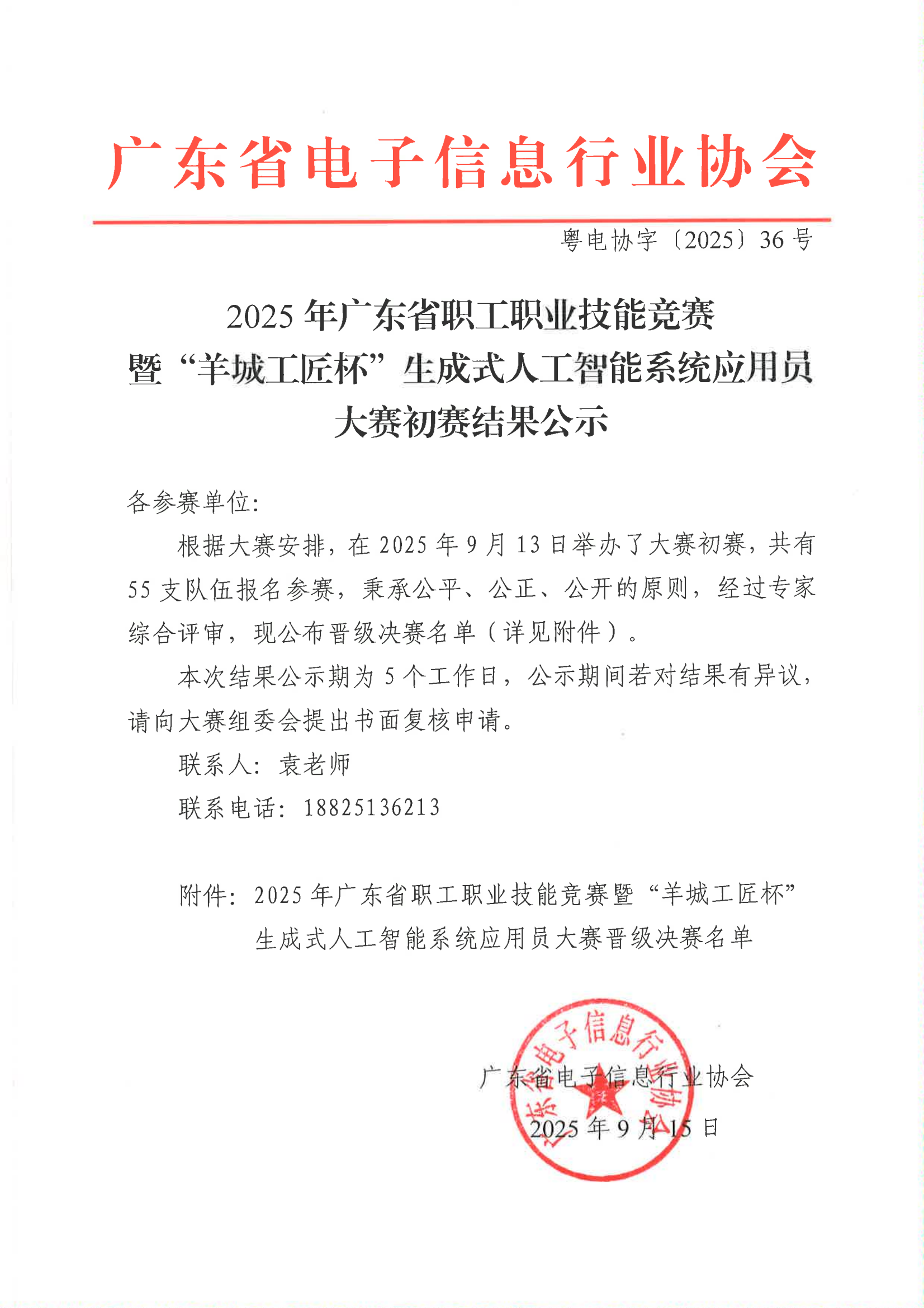 2025年广东省职工职业技能竞赛暨“羊城工匠杯”生成式人工智能系统应用员大赛初赛结果公示