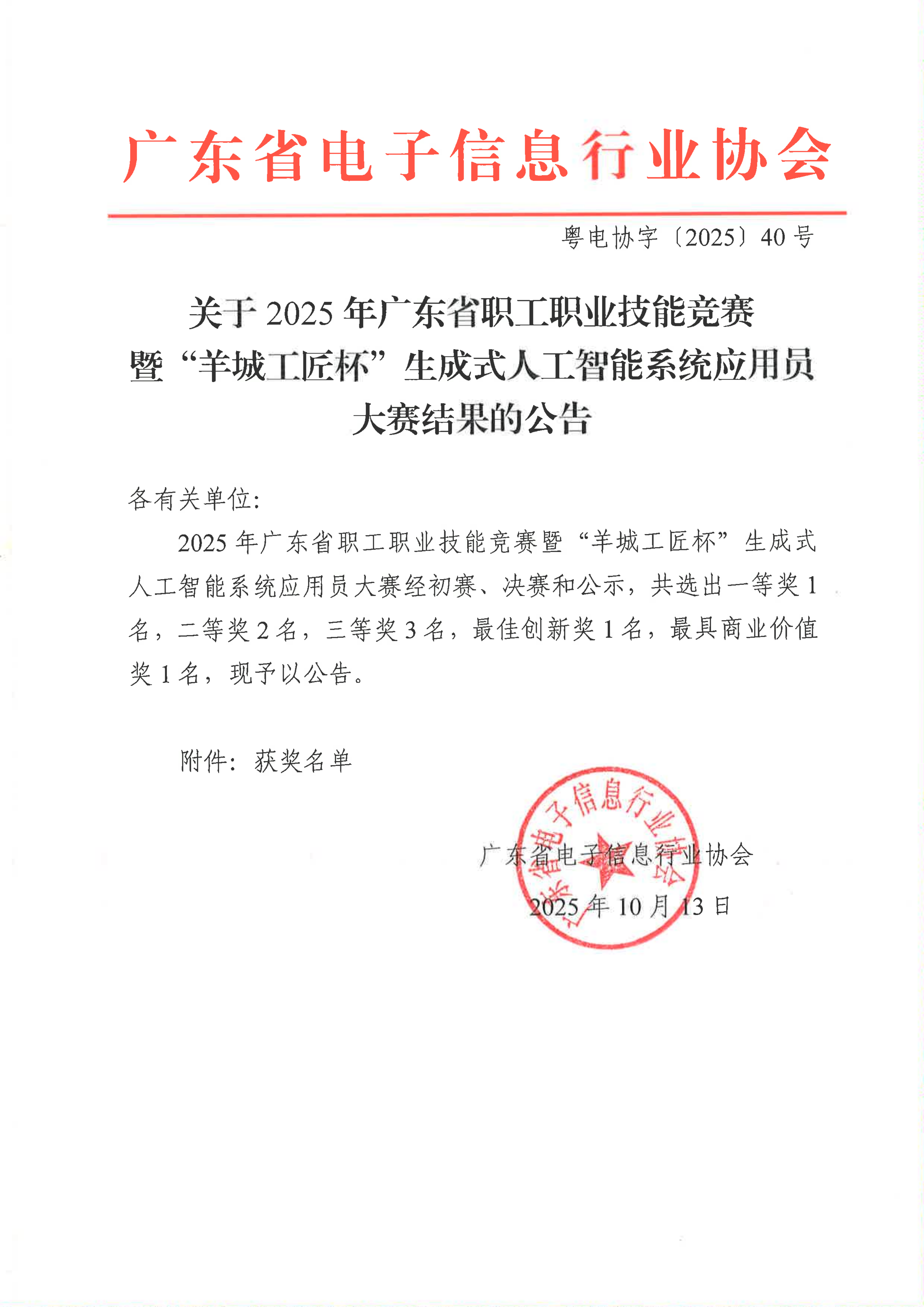 关于2025年广东省职工职业技能竞赛暨“羊城工匠杯”生成式人工智能系统应用员大赛结果的公告